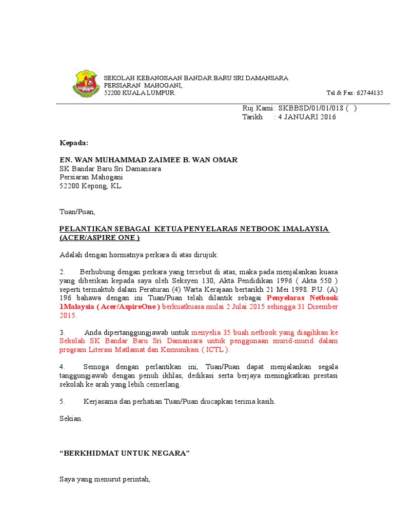 Contoh Surat Lantikan Penyelaras Spbt Englshsimi
